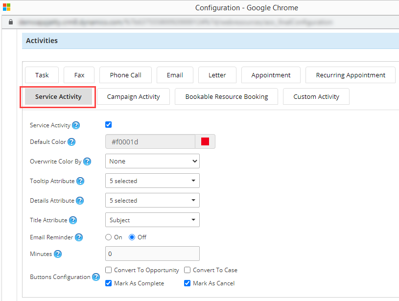 Here, you need to enable the “Service Activity” and configure the activity attributes to display on the activity calendar. You need to enable the buttons to perform the action for service activity.